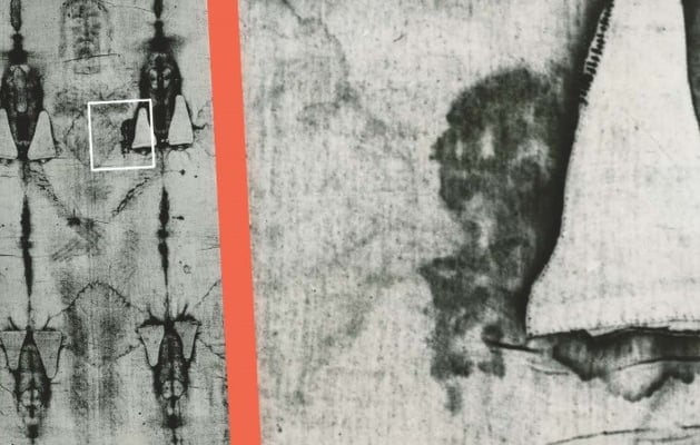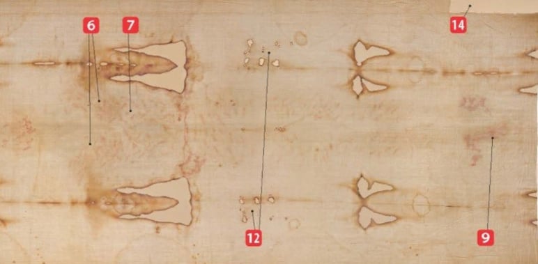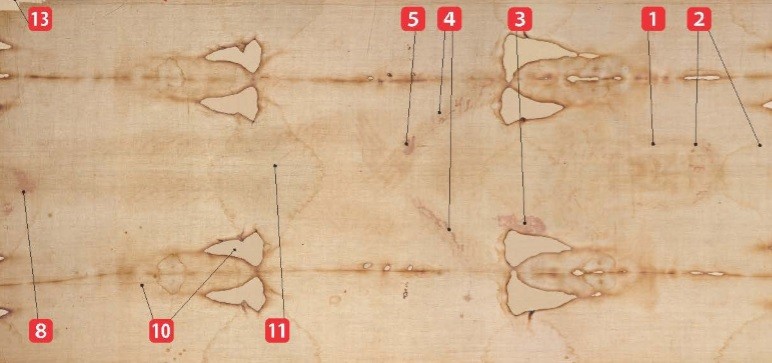13 - Due prelievi In questa zona, nel 1973 e nel 1988, sono stati tolti frammenti di tessuto per analisi sdentifiche e la datazione col metodo del radiocarbonio.